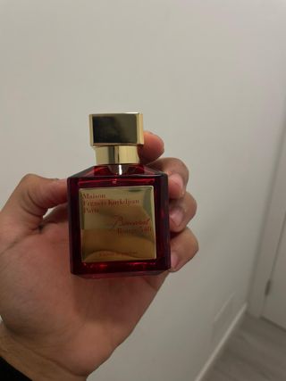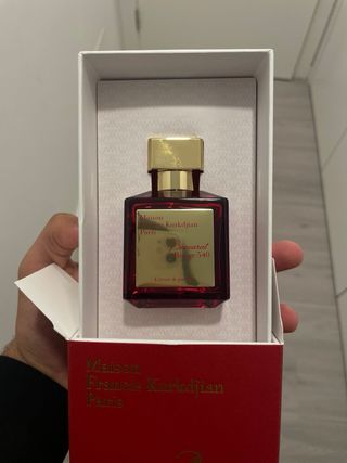 Fragrância luxuosa Baccarat Rouge 540. - Frasco de vidro vermelho. - Detalhes dourados na etiqueta e tampa. - Extrait de Parfum.