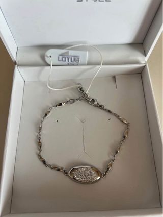Pulseira da marca Lotus Style, com um design elegante e moderno. A peça é ajustável, garantindo um encaixe confortável. - Material: Aço inoxidável. - Acabamento: Prateado. - Detalhe central com pedras brilhantes.