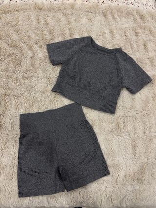 Conjunto de treino composto por top cropped e shorts. - Top com mangas curtas e detalhes vazados. - Shorts de cintura alta com detalhes vazados nas laterais.