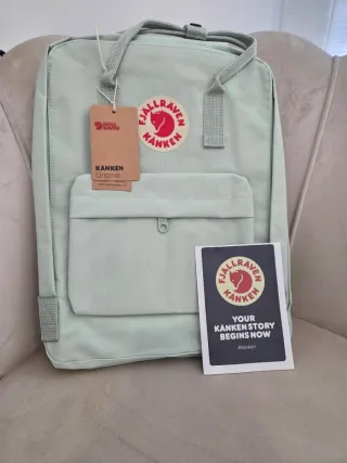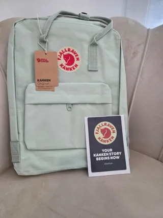 Mochila Fjällräven Kånken clássica, com etiquetas. - Cor verde menta. - Design icónico. - Alças ajustáveis.