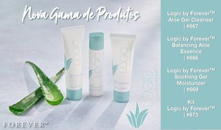Conjunto de produtos Logic by Forever para a pele. Inclui 3 itens: Gel de limpeza, essência e hidratante. Produtos novos, em embalagens impecáveis. - Gel de limpeza Aloe Vera. - Essência Aloe Vera equilibrante. - Hidratante gel calmante.