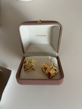 Lindos brincos da marca C.Paravano, banhados a ouro. É um par de brincos com um design de coração. Um par apresenta delicadas pedrarias multicoloridas. - Par de brincos de coração dourado. - Par de brincos de coração dourado com pedras coloridas. - Feitos com banho de ouro 18k.