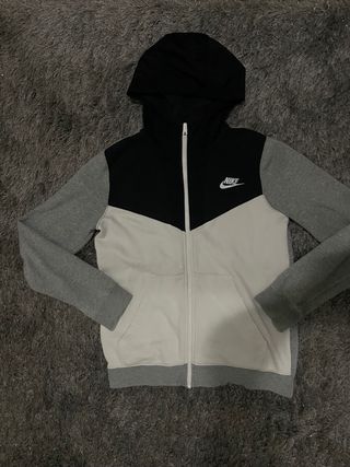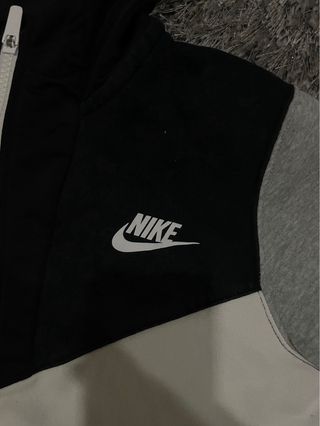 Casaco com capuz da Nike, com um design moderno e confortável. tamanho: 12/152cm - Combinação de cores: preto, cinza e branco. - Fecho completo. - Bolsos frontais.