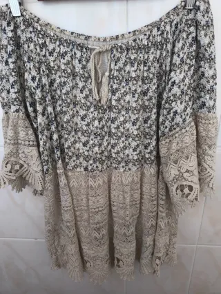Túnica com um padrão floral delicado e detalhes em renda. - Mangas curtas com acabamento em renda. - Decote em V com cordão. - Parte inferior em renda. - Tecido leve e confortável.
