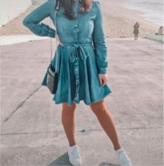 Vestido Guess em ganga, com um tom azul clássico. Possui um cinto para ajustar à cintura e botões frontais. - Manga comprida. - Gola de camisa. - Cinto de tecido. - Fecho de botões.