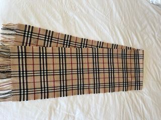 Cachecol Burberry clássico com o icónico padrão xadrez. - Padrão xadrez em bege, preto, branco e vermelho. - Franjas nas extremidades. - 100% autêntico.