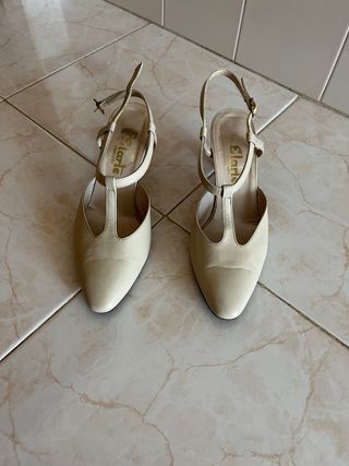 Elegantes sapatos de salto alto da marca Elara em tom bege. Perfeitos para complementar qualquer visual. - Design T-strap. - Fecho com fivela ajustável. - Salto fino. - tem Capas novas - em pele - abertos atrás - tamanho 35,5