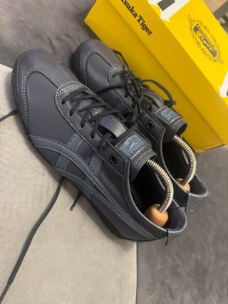 Tênis da marca Onitsuka Tiger em tom cinza. - Design clássico e versátil. - Detalhes em tom mais escuro nas laterais. - Cadarços pretos. - Solado emborrachado.