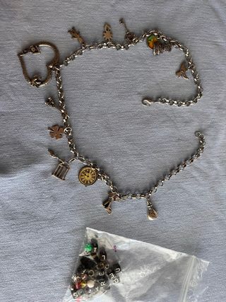 Conjunto de bijuteria com uma corrente e diversos pendentes. - Corrente - Pendentes variados, incluindo um relógio, uma gaiola, um trevo de quatro folhas e outros símbolos. - Inclui um saco com contas para personalização.