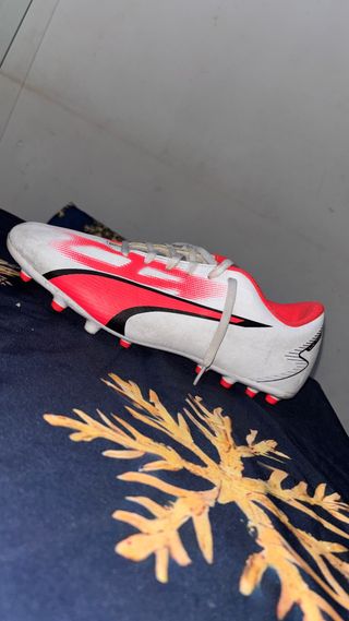 Chuteira de futebol Puma, com um design moderno em branco e detalhes vermelhos. - Design dinâmico com linhas vermelhas. - Logo Puma proeminente. - Sola com travas para campo. Tamanho:43 SEM GARANTIA
