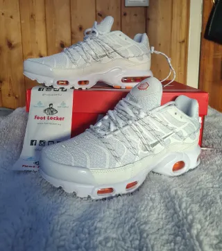 Tênis Nike Air Max TN Utility em branco com detalhes em laranja. - Design moderno e confortável. - Solado com unidades de ar visíveis. - Cadarços brancos com detalhes refletivos.