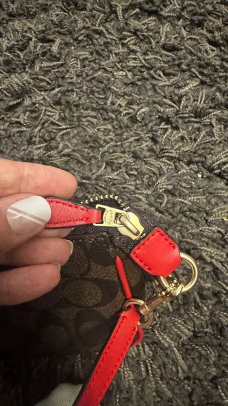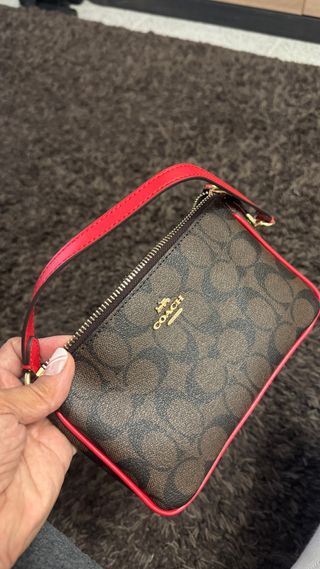 Bolsa pequena da Coach com detalhes em vermelho. - Design monograma. - Alça de mão vermelha.