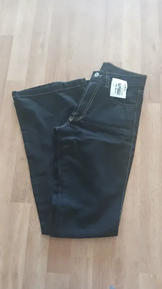 Calças de ganga pretas com corte boca de sino. - Tamanho 34. - Costuras em contraste.