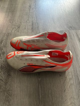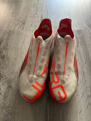 Chuteiras Puma Ultra em branco com detalhes em laranja vibrante. Design moderno e arrojado. - Material leve e respirável. - Solado com travas para melhor aderência. - Fechamento sem cadarços para um ajuste perfeito.