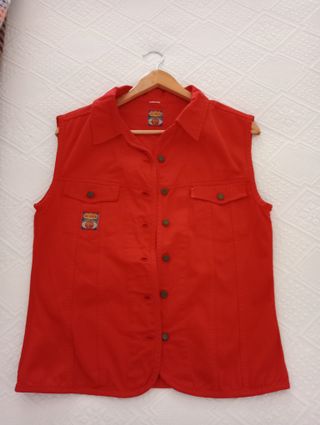 Colete de ganga vermelho com fecho de botões. - Gola clássica. - Dois bolsos frontais com fecho de botão. - Patch decorativo no lado esquerdo do peito.