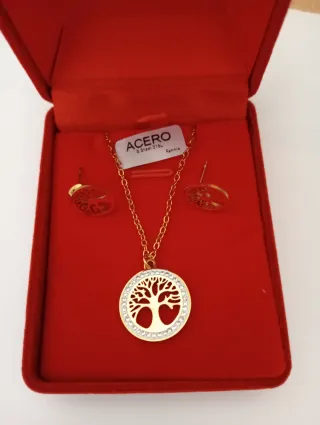 Conjunto de colar e brincos com o tema Árvore da Vida. Um acessório elegante e delicado. - Design em formato de árvore da vida. - Detalhes em pedras brilhantes ao redor do pingente. - Fecho seguro para o colar. - Inclui um par de brincos combinando.