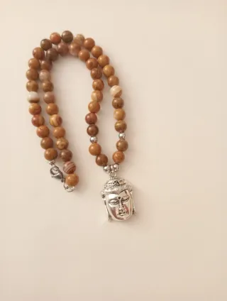 Colar com um pingente de Buda e contas de pedra em tons castanhos. O fecho é prateado. - Pingente detalhado de Buda. - Contas de pedra com variações de cor. - Fecho de metal prateado.
