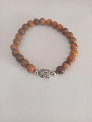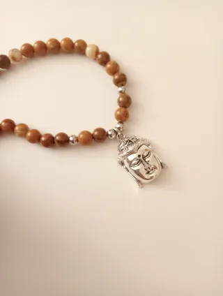 Pulseira com contas em tons terrosos e um pingente detalhado de Buda. - Pingente de Buda em metal. - Contas com acabamento liso e arredondado.