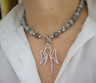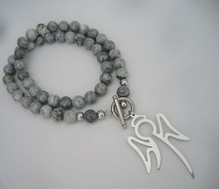 Colar elegante com contas de jaspe cinza e um pingente em forma de anjo. - Contas semipreciosas de jaspe. - Pingente em metal prateado com design de anjo. - Fecho tipo toggle.