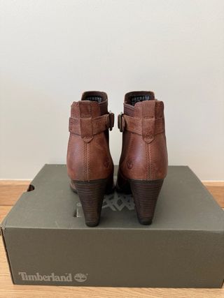 Botas de salto alto da Timberland em tom castanho. - Detalhe de fivela na lateral. - Elástico nas laterais para maior conforto. - Design elegante e moderno. Usadas duas vezes