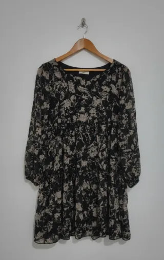 Vestido curto com estampa floral em preto e bege, com um toque boho. - Mangas compridas. - Decote redondo. - Comprimento curto. - Estampa floral. - Estilo boho.