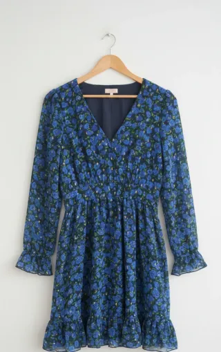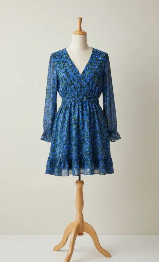 Vestido curto com estampa floral em tons de azul. Possui um estilo romântico e delicado. - Mangas compridas com babados. - Decote em V. - Cintura marcada com elástico. - Barra com babados.