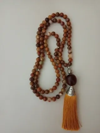 Japamala com 108 contas de pedra natural Jaspe castanha. - Contas de Jaspe castanha. - Detalhe com um pingente de borla amarela. - Acabamento com uma conta maior e detalhes metálicos.