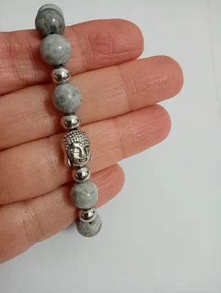 Pulseira unissexo com pedras semipreciosas e um detalhe de Buda. - Pedras em tons de cinza com padrões únicos. - Elemento central em metal com a figura de Buda. - Design elegante e versátil.