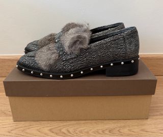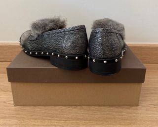 Mocassins Kanna em pele sintética com um acabamento prateado texturizado e detalhes em pelo. - Design elegante com tachas metálicas na sola. - Detalhe de pelo na parte superior.