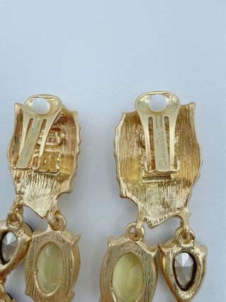 These striking clip-on earrings from Oscar de la Renta are a masterclass in bold, artistic design. Crafted from a textured, gold-tone metal, the top features a sculpted, shield-like shape adorned with raised beaded details, creating a rich, tactile surface.