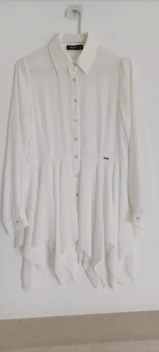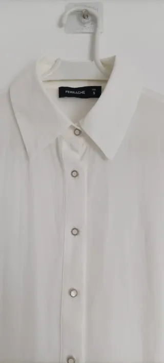 Blusa branca com colarinho e estilo comprida. Linda blusa comprida com folhos Botões brancos com brilhantes Da marca Ferrache - Colarinho clássico. - Fecho de botões. - Manga comprida.