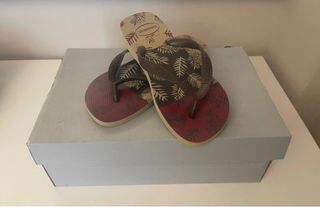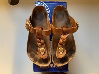 👡 Tamanho 36 - Regular Fit 👡 Chinelo com alguns sinais de uso, por favor ver bem as fotos - Modelo intemporal - Marca de excelente qualidade. Made in Germany - Couro genuíno com pormenores dourados - Modelo distinto com pele entrançada - Palmilha em látex de cortiça com forma anatómica - Preço novas 130€ ✈️ Envio rápido e bem acondicionado