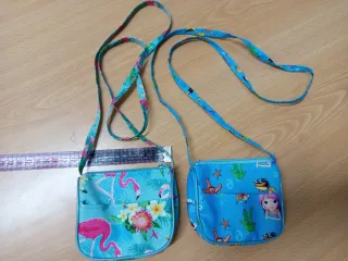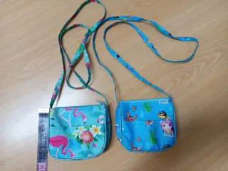 Conjunto de duas bolsas infantis com alças. - Uma bolsa com estampa de flamingos e flores. - Outra bolsa com estampa de fundo do mar e personagem. - Alças coloridas para usar a tiracolo.