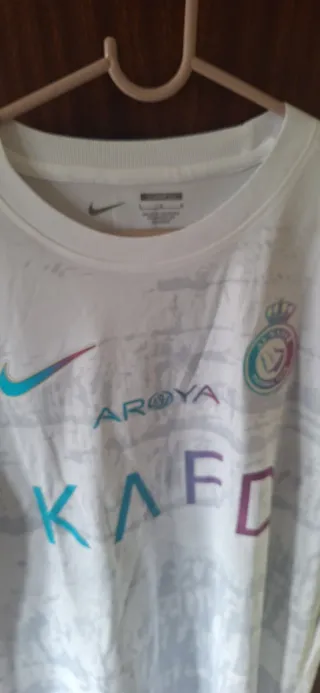 Camisola branca da Nike com detalhes em tons de azul e roxo. Apresenta o logótipo da Nike e o emblema do clube. - Design moderno com padrão subtil. - Logótipo AROYO no peito. - Detalhes gráficos KAF em destaque.
