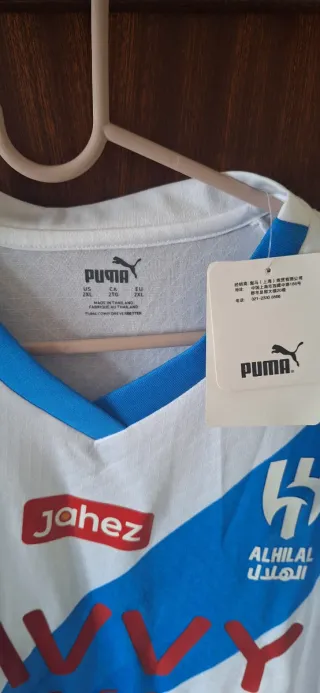 Camisola desportiva com um design moderno. - Gola em V com detalhes azuis. - Padrão diagonal azul na frente. - Logos da Puma aplicados. - Patrocínios estampados na frente e manga.