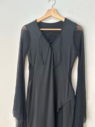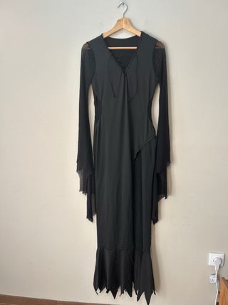 Vestido longo preto com mangas em tule e detalhes em renda. - Mangas compridas em tule. - Decote em V com amarração. - Barra com acabamento irregular. Inclui também meias rede com brilhos