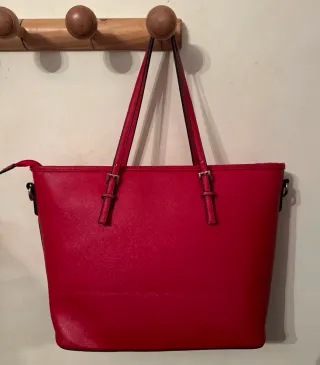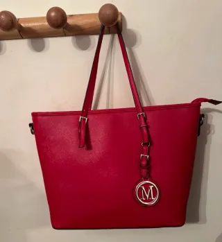 Mala tote de cor vermelha com detalhe dourado. - Alças de ombro. - Fecho de correr. - Detalhe de pendente circular. - Muito boa e elegante. Pequeno detalhe para limpar na base - ver foto.