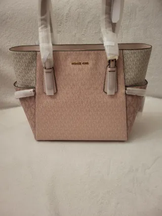 Mala Michael Kors Voyager em tons de bege e rosa claro. - Design com padrão MK. - Alças de mão e ombro. - Bolsos laterais. - Detalhes em dourado. - Espaçosa e Elegante. - Com etiquetas e proteções de origem.