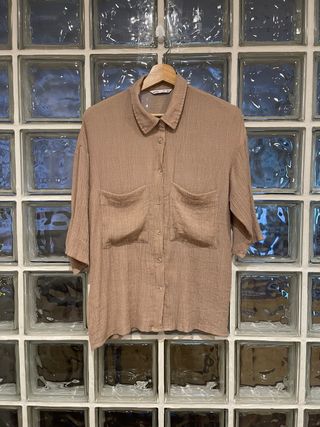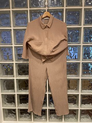 🤎 Como novo 🤎 Tamanho L (veste pequeno, facilmente veste M) - Conjunto intemporal que permite vestir junto ou combinado com outras peças - Tecido estilo crepe mas de bom toque - Camisa de manga curta - Calças com cintura de elástico e corte culotte - Calças culotte que têm um corte mais curto, termina à altura do tornozelo - Não têm arranjos realizados - Não tem etiquetas interiores, foram cortadas 🧼 Envio tudo em boas condições, lavado e engomado ✈️ Envio rápido e bem acondicionado