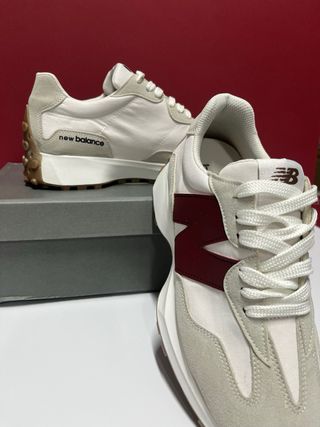 Tênis New Balance 327 em tons de bege e branco. Design moderno e confortável. - Detalhe de N lateral em tom vinho. - Solado tratorado em borracha. - Logo new balance na lateral.