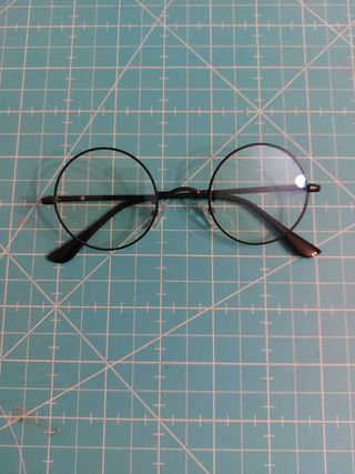Armações de óculos pretas, formato redondo com um diametro de 23mm, largura de 132mm e um espaçamento para o nariz de 23mm, é só a armação as lentes que tem são só a enfeitar.