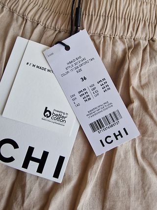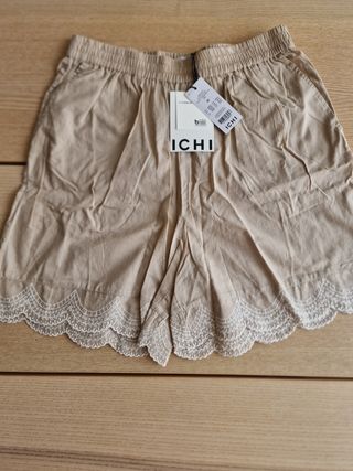 Calções beges da marca ICHI, perfeitos para dias de calor. Versáteis e confortáveis, ideais para combinar com diversos looks. Adicione um toque de estilo ao seu guarda-roupa.