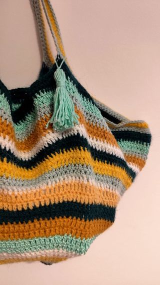Linda mala de crochê, feita à mão com um design multicolorido. - Confeccionada com técnica de crochê. - Possui alças resistentes. - Detalhe charmoso de franja.