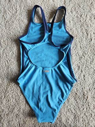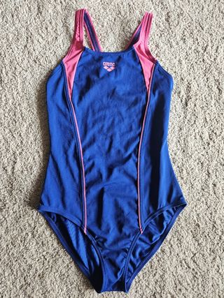 Fato de banho da marca Arena com um design desportivo e moderno. - Combinação de cores azul e rosa. - Alças finas e confortáveis. - Costuras laterais em rosa para um toque de estilo.