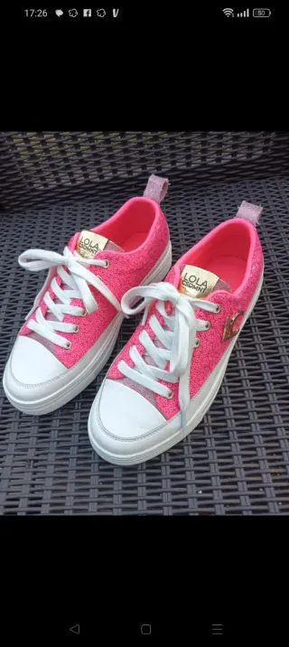 Sapatilhas da marca Lola Casademunt com um design vibrante e moderno. Usadas apenas uma vez. - Detalhe de lantejoulas brilhantes. - Sola branca em contraste. - Cadarços brancos. - Logo dourado na palmilha.