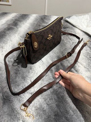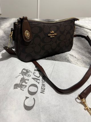 Mala da marca Coach em castanho com detalhes. - Padrão C característico da marca. - Ferragens douradas. - 2 Alça de ombro em pele castanha.
