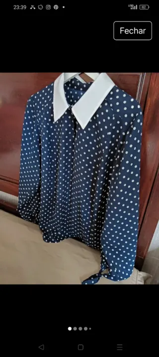 Blusa elegante em seda de excelente qualidade, muito delicada com botão requintado. Feita à mão, exclusiva. - Gola branca com detalhe. - Padrão de bolinhas. - Mangas compridas.