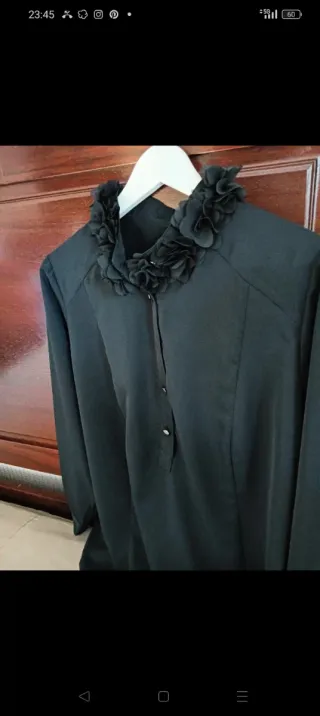 Blusa elegante em seda. Tem aplicação em relevo na gola. Muito delicada, modelo exclusivo. Feita à mão, usada apenas uma vez. - Material: Seda - Cor: Preta