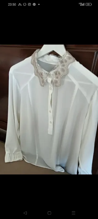 Blusa elegante em seda com gola em renda de excelente qualidade. Feita à mão, modelo exclusivo, completamente nova. - Mangas compridas com punhos originais.