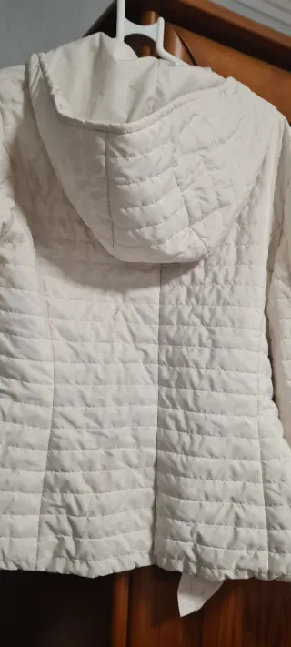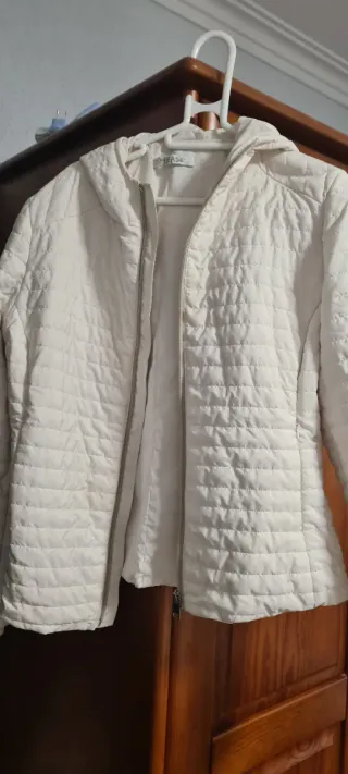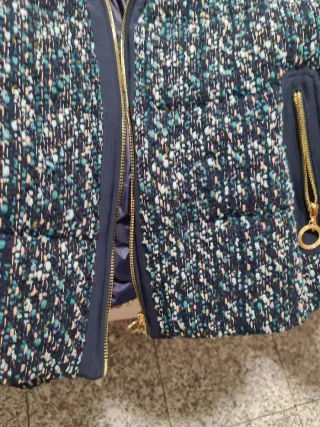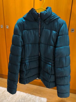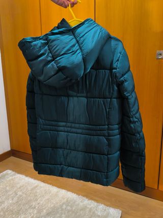 Casaco quente e confortável em ótimo estado. - Cor azul petróleo. - Design acolchoado. - Capuz integrado. - Fecho frontal com fecho de correr.